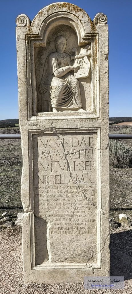 Para Lucunda, esclava de Mario Valerio Vitulo e hija de Nigella. Desahuciada al acercarme a mis 16 años, cedí, vencida, al peso de mi destino. He aquí lo que puede abatir tu corazón, lector, la causa prematura, lamentable, de mi sepultura. Pero, llegada a mi fin, descanso en un lugar querido, antes que las enfermedades destruyeran mi cuerpo con violencia de un tumor intolerable para cualquiera, ahora, libre de preocupaciones, reposo bajo la hierba ligera. Ahora os toca a vosotros el cuidado de mi sepultura, padres, querido esposo, adiós para siempre.
